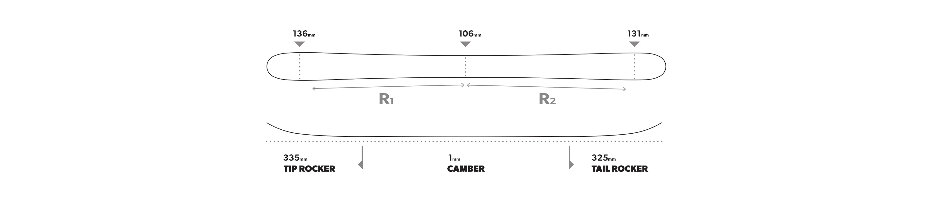 Each model has varying amounts of tip/tail rocker and camber underfoot to suit its terrain profile. This assists float off-piste and stability on-piste.